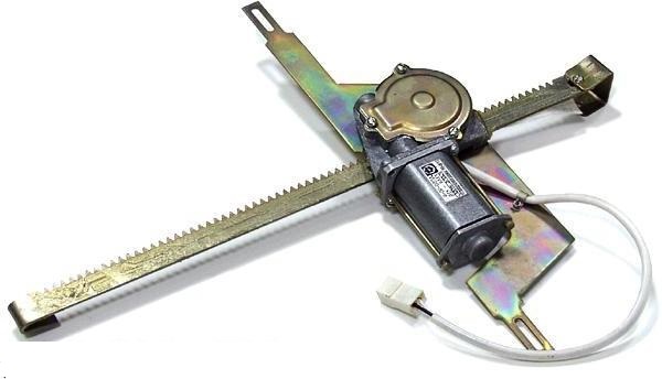 В реечном устройстве пластина со стеклом движется вверх и вниз по вертикальной зубчатой рейке. На пластине установлено зубчатое колесо, которое входит в зацепление с шестерней привода. Таким образом, движение выполняется либо вниз, либо вверх. Преимущество реечного стеклоподъемника – надежность и плавность перемещения стекла. Недостатком является массивность конструкции, что ограничивает его применение.