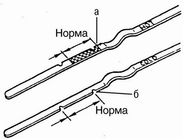 Оптимальный вариант: щуп испачкан в масле выше отметки «минимально», но не достигая отметки, когда высокий уровень вреден.