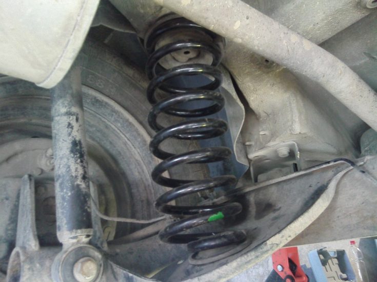 При демонтаже передних пружин необходимо снять верхнюю чашку опорного подшипника. Раскрутить крепления стойки и убрать нижний болт, откинув суппорт. После снимается амортизатор в сборе с пружиной, и изношенный элемент заменяется на новый.